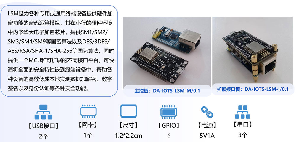 LSM是為(wèi)各種專用或通(tōng)用終端設備提供硬件加密功能的密碼運算(suàn)模組,其在小(xiǎo)行(xíng)的硬件環境中內(nèi)嵌華大(dà)電(diàn)子加密芯片,提供SM1/SM2/SM3/SM4/SM9等國密算(suàn)法以及DES/3DES/AES/RSA/SHA-1/SHA-256等國際算(suàn)法,同時(shí)提供一個(gè)MCU和(hé)可(kě)擴展的不同接口平台,可(kě)快速将全面的安全特性嵌到終端設備中,幫助各種設備的高(gāo)效低(dī)成本地實現數(shù)據加解密、數(shù)字簽名以及身份認證等各種安全功能。